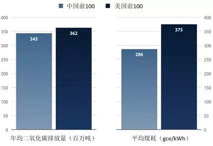 圖2 中美燃煤機(jī)組二氧化碳排放和發(fā)電煤耗對(duì)比