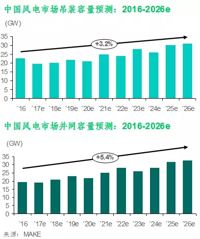 MAKE預(yù)計(jì),2017年甘肅與吉林將沒有新增并網(wǎng)容量,內(nèi)蒙、黑龍江與寧夏各省的新增并網(wǎng)容量將不足300MW;盡管海上吊裝容量預(yù)測上調(diào)194MW,仍無法抵消西北地區(qū)新增容量的大幅減少。