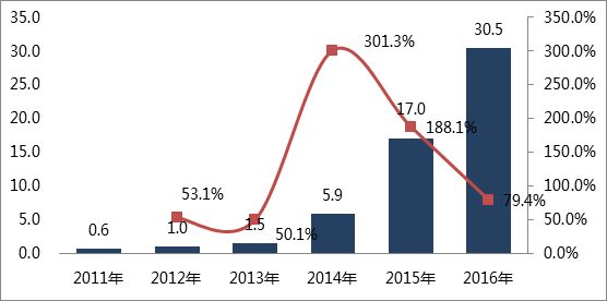 2011-2016年中國鋰動(dòng)力電池出貨量:Gwh