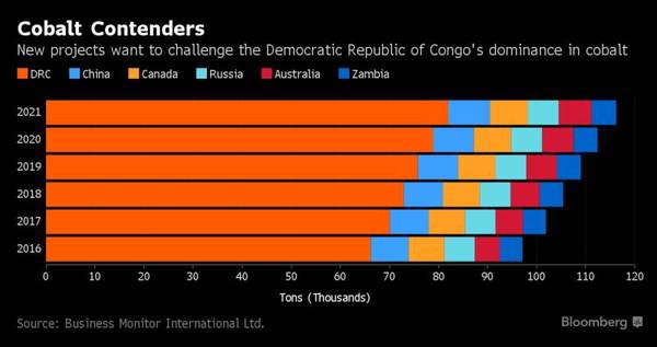 繼2016年鈷價上漲一倍有余之后,位于澳大利亞、美國和加拿大等地的一系列鈷開采項目正陸續(xù)上馬。嘉能可的鈷產(chǎn)量占全世界的近三分之一,主要來自剛果,而剛果是迄今為止全球最大的鈷生產(chǎn)地,占全球總產(chǎn)量的65%。