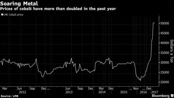 2016年底時,倫敦金屬交易所鈷價約在每噸3.2萬美元,較一年前上漲36%,2017年迄今已上漲約65%,至每噸逾5.6萬美元,折合每磅(1磅=454克)超過25.4美元。CRU的斯賓塞說,2017年,鈷價可能會上漲一倍,到2020年可能依然會保持在每磅20美元以上。