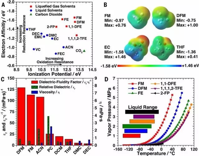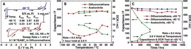 加州大學(xué)圣地亞哥分校Y. Shirley Meng(通訊作者)等人將具有優(yōu)異物理化學(xué)特性以及絕緣流體性質(zhì)的液相電解質(zhì)用于電化學(xué)電容器中,而這種電解質(zhì)的成分二氟甲烷在標(biāo)準(zhǔn)大氣壓下為氣相,這種液化氣電解質(zhì)在-78到65℃的工作范圍和大電壓窗內(nèi)表現(xiàn)出很好的穩(wěn)定性和優(yōu)異的性能。