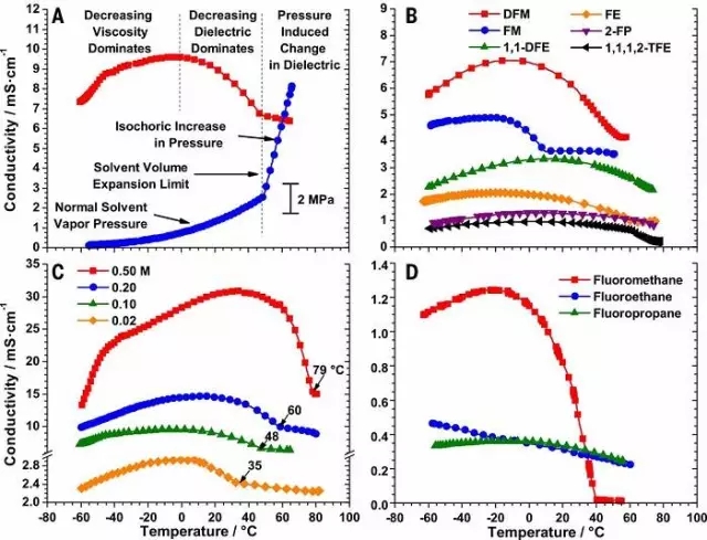 自從電化學(xué)電容器和鋰離子電池實(shí)現(xiàn)商業(yè)化以來(lái),它們?cè)陔娊赓|(zhì)上所做的調(diào)整就微乎其微,這也限制了設(shè)備性能的提升。目前電解質(zhì)體系大多為液相或固相,大部分氣體在室溫下是典型的非極性、分子間的作用力也很小,更不能實(shí)現(xiàn)對(duì)鹽的溶解。但一些極性氣體如氟代、氯代甲烷在經(jīng)過(guò)低溫或是調(diào)控壓力使之液化后,就表現(xiàn)出溶解鹽的能力,可以形成液化氣電解質(zhì)。