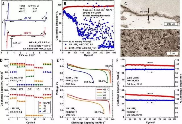 鋰金屬為負(fù)極,鈷酸鋰為正極構(gòu)建鋰離子電池時(shí),具有很高的循環(huán)性能,庫(kù)倫效率達(dá)到ca.97%,開(kāi)路電壓4V,同時(shí)在-60℃的低溫下運(yùn)行還可保持很好的容量保持率。以上研究成果以“Liquefied gas electrolytes for electrochemical energy storage devices"為題發(fā)表在2017年6月15日Online的Science上。