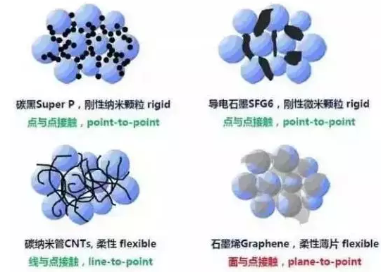 作為鋰離子電池導電劑材料使用的主要有常規(guī)導電劑SUPER-P、KS-6、導電石墨、碳納米管、石墨烯、碳纖維VGCF等,這些導電劑擁有各自的優(yōu)劣勢。具體來看: