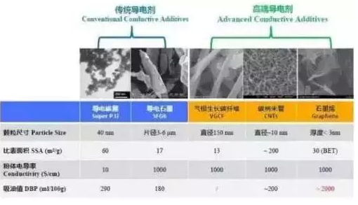 目前國內(nèi)鋰離子電池導電劑還是以常規(guī)導電劑SP為主。炭黑具有更好的離子和電子導電能力,因為炭黑具有更大的比表面積,所以有利于電解質(zhì)的吸附而提高離子電導率。另外,炭一次顆粒團聚形成支鏈結構,能夠與活性材料形成鏈式導電結構,有助于提高材料的電子導電率。