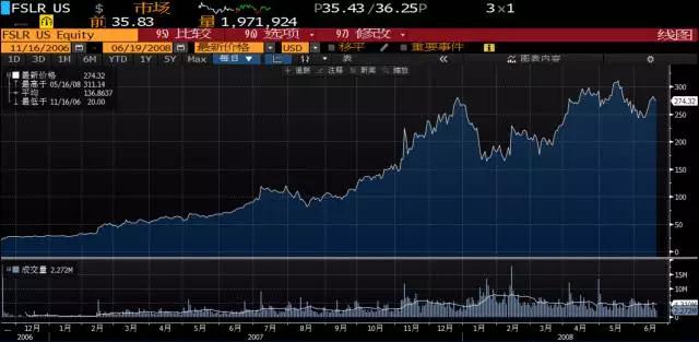在光伏剛剛出來(lái)的時(shí)候,資本市場(chǎng)對(duì)光伏企業(yè)是極度的狂熱。在2005-2007年,兩年的時(shí)間里,那時(shí)候光伏組件的龍頭,F(xiàn)irst Solar的漲幅超過(guò)13倍,市值約為200億美金,而2007年,F(xiàn)irst Solar的銷售額僅為5億美金,盈利為1.6億美金,對(duì)應(yīng)PS為40倍,PE為125倍。