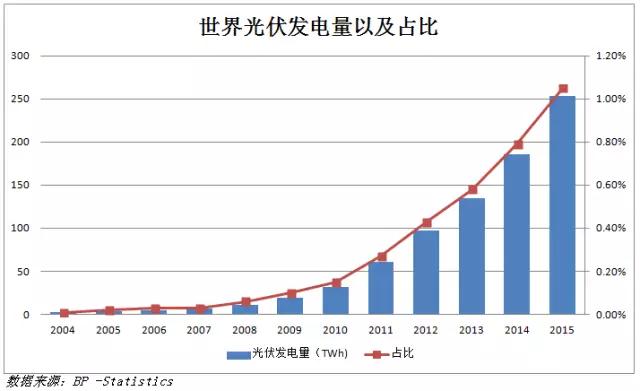 我們回顧光伏的歷史:從2004年到2015年,光伏發(fā)電量從2004年的2.6TWh增長(zhǎng)了近100倍,到2015年的253TWh,同時(shí),光伏占全世界的發(fā)電量占比從2004年的0.01%也增長(zhǎng)了100倍至2015年的1.05%。
