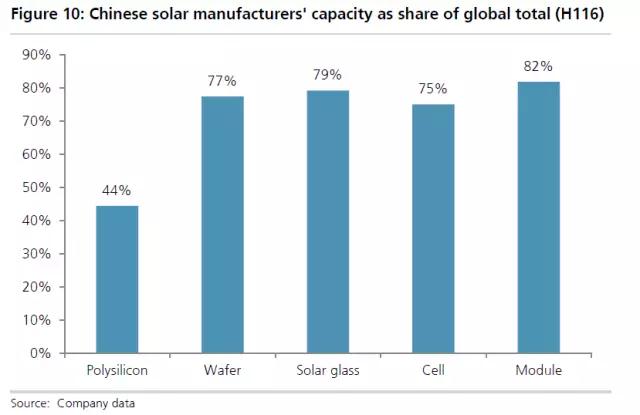根據(jù)UBS的統(tǒng)計(jì),中國(guó)公司在全球多晶硅占44%,硅片占77%,光伏玻璃占79%,電池片占75%,模組82%。
