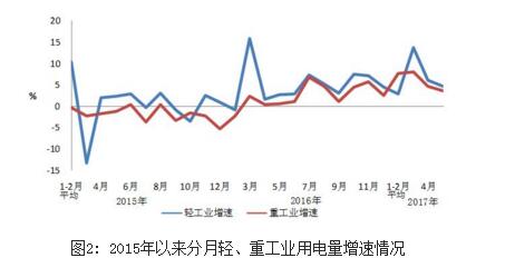 1-5月份,全國工業(yè)用電量16827億千瓦時,同比增長6.3%,增速比上年同期提高6.0個百分點,占全社會用電量的比重為69.4%,對全社會用電量增長的貢獻(xiàn)率為69%。其中,輕工業(yè)用電量為2826億千瓦時,同比增長6.1%,增速比上年同期提高2.7個百分點;重工業(yè)用電量為14001億千瓦時,同比增長6.4%,增速比上年同期提高6.6個百分點。