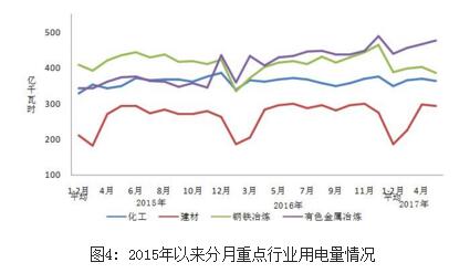 1-5月份,化學(xué)原料制品、非金屬礦物制品、黑色金屬冶煉和有色金屬冶煉四大高載能行業(yè)用電量合計7216億千瓦時,同比增長6.9%,增速比上年同期提高10.5個百分點;合計用電量占全社會用電量的比重為29.7%,對全社會用電量增長的貢獻(xiàn)率為32.0%。其中,化工行業(yè)用電量1795億千瓦時,同比增長3.3%,增速比上年同期回落1.1個百分點;建材行業(yè)用電量1191億千瓦時,同比增長3.3%,增速比上年同期提高4.8個百分點;黑色金屬冶煉行業(yè)用電量1952億千瓦時,同比增長4.2%,增速比上年同期提高14.4個百分點;有色金屬冶煉行業(yè)2279億千瓦時,同比增長14.5%,增速比上年同期提高19.5個百分點。