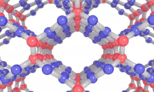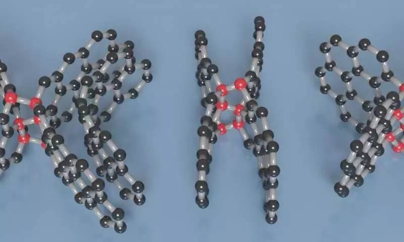 通過混合sp2 / sp3的通道觀察壓縮玻璃碳中的互穿石墨烯網(wǎng)絡。 石墨烯片(藍色球體)在菱形節(jié)點(紅色球體)處交聯(lián)。
