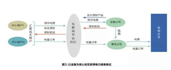 由售電公司通過金融公司發(fā)行無風(fēng)險的“充電寶”理財產(chǎn)品,電力用戶以預(yù)存電費方式,通過互聯(lián)網(wǎng)B2C平臺購買“充電寶”理財產(chǎn)品。售電公司從互聯(lián)網(wǎng)平臺獲取電量訂單和電費,用戶從互聯(lián)網(wǎng)平臺購入電量并獲得理財收益,金融公司按照用戶實際用電量的大小為其分配理財產(chǎn)品份額,用戶用電量越多,可申請的理財產(chǎn)品份額越大。通過互聯(lián)網(wǎng)平臺將眾多的中小用戶匯集成大用戶,形成規(guī)模優(yōu)勢,所匯集的巨額電量訂單,不僅可以支持自有發(fā)電企業(yè),也可在電力市場采購低價的電能,提高平臺運作收益。