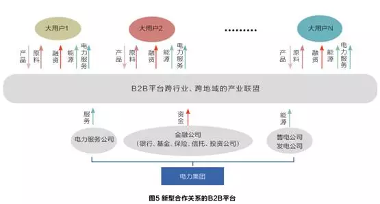通過建立B2B平臺,將能源、金融、產(chǎn)品、服務(wù)以及大數(shù)據(jù)等全面產(chǎn)業(yè)信息及供需渠道進(jìn)行了融合,為電力集團(tuán)和大用戶建立綜合的供需渠道,推動各方產(chǎn)業(yè)健康發(fā)展,形成互聯(lián)互通的生態(tài)系統(tǒng)。(見圖5)