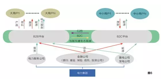為充分利用互聯(lián)網(wǎng)的零距離、零時差的資源共享優(yōu)勢,在建立中小電力用戶的B2C平臺以及與大用戶之間的B2B平臺后,通過C2B對兩個平臺進(jìn)行融合,以金融為核心,以供應(yīng)鏈為紐帶,以能源服務(wù)為支持,構(gòu)建融合多產(chǎn)業(yè)的互聯(lián)互通生態(tài)系統(tǒng)。(見圖6)