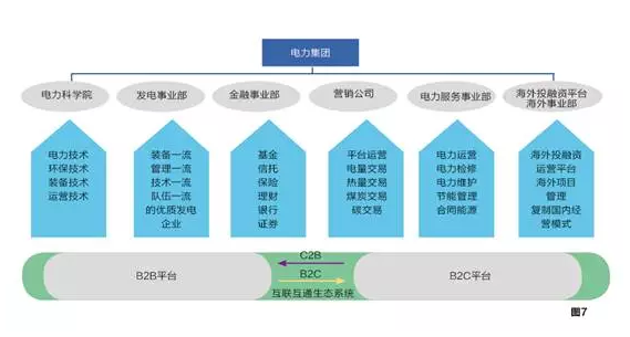 以發(fā)電業(yè)務(wù)為基礎(chǔ),以金融業(yè)務(wù)為核心,以電力營銷為龍頭,以電力科研和電力服務(wù)為支撐,構(gòu)建全球化互聯(lián)互通生態(tài)系統(tǒng)。(見圖7)