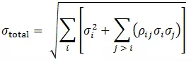 本次會(huì)上,針對(duì)發(fā)電量相關(guān)影響因素的不確定分析方法現(xiàn)有成果進(jìn)行分組討論和梳理,重點(diǎn)討論了各個(gè)不確定度的合成。對(duì)于互不相關(guān)因素的不確定度合成,通常采取先求平方和再開方的計(jì)算方式,但對(duì)于那些具有潛在相關(guān)性的不確定度影響因素,需要額外添加相關(guān)項(xiàng)(合成公式見下式),在合成時(shí)要尤為注意。