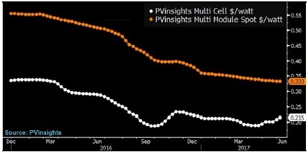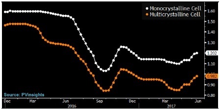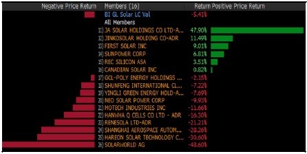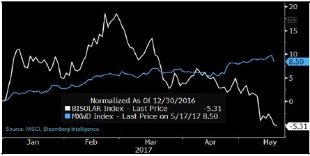 繼2016年大跌52%之后,2017年年初以來,BI 旗下行業(yè)研究的太陽能標(biāo)桿企業(yè)相關(guān)股指下跌5%。市場(chǎng)情緒可能已經(jīng)因?yàn)橹忻纼蓢?guó)貿(mào)易關(guān)系緊張(歐盟將對(duì)中國(guó)制造太陽能電池板的反傾銷關(guān)稅延長(zhǎng)了18個(gè)月)、國(guó)際油價(jià)下跌、SolarWorld申請(qǐng)破產(chǎn)(2017年年內(nèi)股價(jià)重挫49%)而進(jìn)一步惡化。First Solar和SunPower(2017年股價(jià)分別漲9%和7%)這類美國(guó)太陽能企業(yè)削減成本的努力可能緩和市場(chǎng)對(duì)降價(jià)壓力和行業(yè)產(chǎn)能過剩的擔(dān)憂。