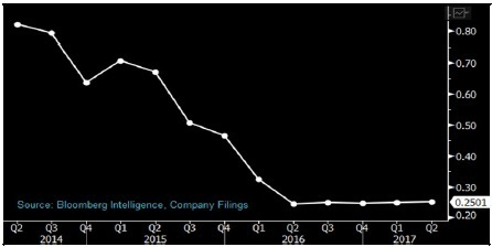 Bloomberg Intelligence 旗下分析的太陽能行業(yè)企業(yè) 2017 年業(yè)績(jī)趨勢(shì)圖