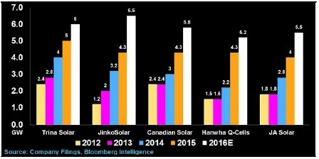 據(jù)BNEF估算,2016年全球太陽能需求約為7萬兆瓦,到2016年年底額定產(chǎn)能為16萬兆瓦。今年大型太陽能電池板供應(yīng)商將成為產(chǎn)能增長(zhǎng)的領(lǐng)頭羊,其中中國(guó)天合光能有限公司、加拿大太陽能光伏公司阿特斯、中國(guó)的晶科能源控股有限公司和晶澳太陽能有限公司各自產(chǎn)能將分別增長(zhǎng)20%、34%、51%和38%。