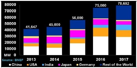 雖然中國(guó)、日本和美國(guó)這三大重要市場(chǎng)的太陽能裝機(jī)新增需求增長(zhǎng)停滯,但2017年全球裝機(jī)總需求料將繼續(xù)增加。BNEF預(yù)測(cè),2017年印度、拉美和東南亞可能給全球需求帶來新的動(dòng)力,總需求將由此增至7.86萬兆瓦,超過2016年7.5萬兆瓦的估算需求量。2017年中國(guó)計(jì)劃進(jìn)一步削減新能源補(bǔ)貼,以求降低這類補(bǔ)貼造成的財(cái)政赤字。因此,在2016年達(dá)到創(chuàng)紀(jì)錄新高以后,太陽能需求的增速可能受到抑制。