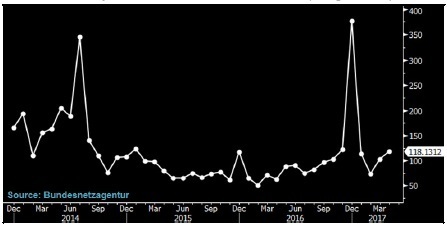 德國(guó)太陽能月均安裝量趨勢(shì)圖(單位:兆千瓦特)
