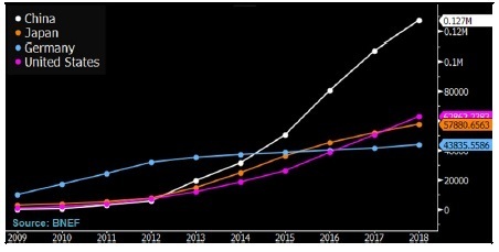 各國(guó)累計(jì)太陽能安裝量趨勢(shì)對(duì)比圖(單位:千兆瓦特)