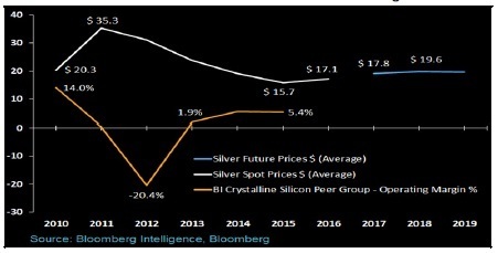2016年現(xiàn)貨銀價(jià)均價(jià)為每盎司17.13美元,較2015年均價(jià)上漲9%,因此太陽能電池制造商2016年的盈利可能縮水。共識(shí)預(yù)期顯示,到2018年,銀價(jià)可能再攀升16%。這可能導(dǎo)致太陽能電池制造商的投入成本增加,但到2018年現(xiàn)貨銀價(jià)料將始終低于2012年到2014年的平均水平:每盎司24.90美元。太陽能制造商的盈利已經(jīng)與銀價(jià)呈現(xiàn)負(fù)相關(guān)。太陽能組件價(jià)格和多晶硅成本對(duì)制造商盈利也很重要。