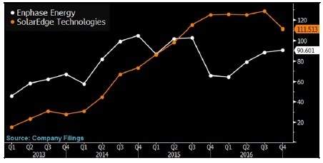 2017年1季度,太陽能逆變器供應(yīng)商Enphase推出最新款微型太陽能逆變器,集太陽能發(fā)電、儲(chǔ)能和家用能源管理系統(tǒng)于一身。其競(jìng)爭(zhēng)對(duì)手SolarEdge正在向歐洲市場(chǎng)推廣類似產(chǎn)品。家用能源管理系統(tǒng)給逆變器供應(yīng)商帶來了售后服務(wù)的商機(jī),比如提高能源效率的服務(wù)、監(jiān)控以及保養(yǎng)設(shè)備。逆變器供應(yīng)商還可能開發(fā)新的銷售商機(jī),以滿足市場(chǎng)需求和電網(wǎng)的服務(wù),比如儲(chǔ)能集群產(chǎn)品。