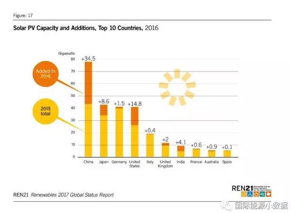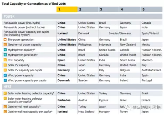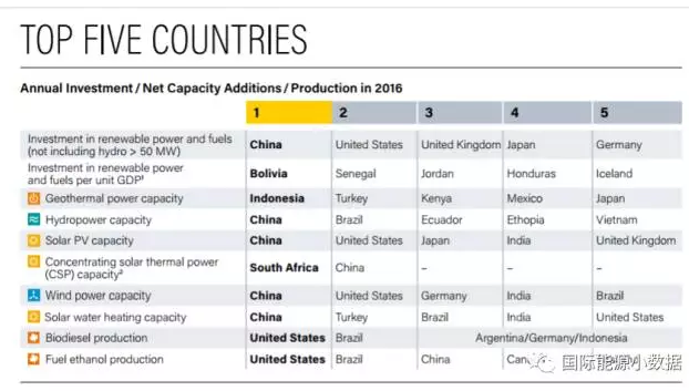 此外,玻利維亞獲得2016年單位GDP投資可再生能源比例冠軍,冰島獲得人均可再生能源裝機(jī)冠軍,德國(guó)獲得人均光伏裝機(jī)第一,西班牙獲得太陽(yáng)能光熱發(fā)電累計(jì)裝機(jī)容量冠軍。