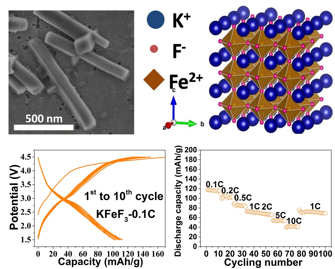 立方鈣鈦礦是近年來太陽能電池、燃料電池和電催化的研究熱點,但之前由于其密結構特點很少被嘗試用作儲能電極。事實上,健壯構架的鈣鈦礦相具有本征的三維擴散通道,但是以前報道的NaFeF3中的Na填充通道較窄,導致Fe-F八面體晶格扭曲,使某些方向的通道變得更窄,影響其儲鈉高倍率的實現。為了實現鈣鈦礦相的規(guī)整化和開框架化,該團隊提出用等摩爾數的K+取代Na+作為通道填充劑,通過液相方法合成了一種立方相的KFeF3。KFeF3作為3V區(qū)間正極,實現了晶體結構的高度對稱性和各向同性的三維快速離子通道,其表現出固溶反應(近零應力)的電化學行為和高的本征擴散系數(7.9–9.8×10?11cm2s?1),從而使可逆儲鈉容量在0.1、2和10 C下分別可達110、70和40 mAh g?1,這也是目前所報道的氟化物儲鈉的最高倍率性能。同時,該團隊首次將這一氟化物作為鉀離子電池正極材料進行測試,在0.5 C下有60mAh/g的穩(wěn)定放電容量。