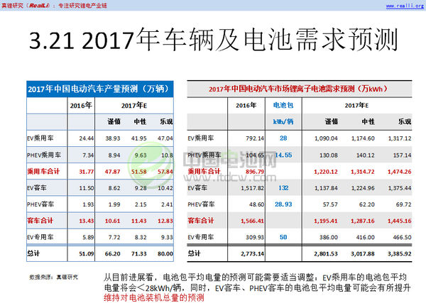 據(jù)以上數(shù)據(jù)推算,2017年中國電動(dòng)汽車市場(chǎng) 鋰離子電池 需求謹(jǐn)慎預(yù)測(cè)為2,801.53萬kWh、中性預(yù)測(cè)為3,017.88萬kWh、樂觀預(yù)測(cè)為3,385.92 萬kWh。墨柯認(rèn)為,2017年EV乘用車的電池包平均電量將會(huì)小于28kWh/輛,同時(shí),EV客車、PHEV客車的電池包平均電量可能會(huì)有所提升。