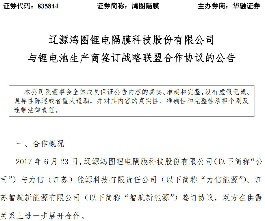 鴻圖隔膜表示,與力信能源、智航新能源彼此已經(jīng)形成了供需關(guān)系,為了共同發(fā)展,實(shí)現(xiàn)雙贏的奮斗目標(biāo),經(jīng)過彼此協(xié)商,在平等自愿的前提下,結(jié)為戰(zhàn)略聯(lián)盟關(guān)系。公司作為國(guó)內(nèi)高端的鋰電池濕法隔膜生產(chǎn)企業(yè),具備鋰離子電池隔膜深度的研發(fā)能力,并且隨公司二期產(chǎn)能的逐步釋放,公司與下游客戶在此時(shí)簽訂更為緊密的戰(zhàn)略聯(lián)盟關(guān)系,有助于公司產(chǎn)品迅速投放市場(chǎng),增加產(chǎn)品在市場(chǎng)上的競(jìng)爭(zhēng)力,提前占領(lǐng)市場(chǎng)。此次合作將進(jìn)一步增強(qiáng)公司在鋰電池行業(yè)經(jīng)營(yíng)領(lǐng)域的綜合實(shí)力,提升公司品牌影響力,對(duì)公司未來經(jīng)營(yíng)將有積極影響。