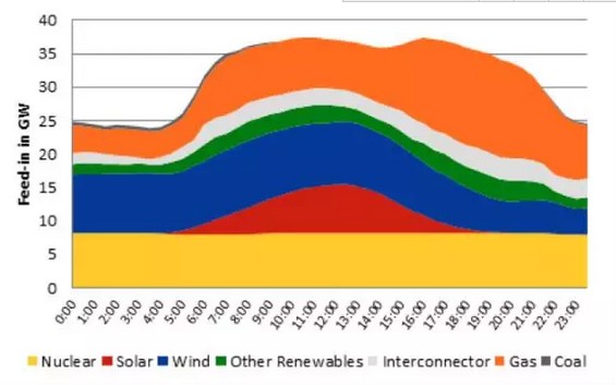人們本來應(yīng)該足夠驚奇,但現(xiàn)今已經(jīng)形成習(xí)慣:無論是英國所剩不多的核電幾乎保持一條直線發(fā)電曲線,還是德國的火電機(jī)組已經(jīng)被限制在非常狹小的活動(dòng)帶里調(diào)節(jié),都在陳述這樣一個(gè)事實(shí):隨著可再生能源的發(fā)電比例不斷提高并逐漸跨越50%這一分界線,整個(gè)電力系統(tǒng)的靈活調(diào)節(jié)重心也隨之由傳統(tǒng)的火電機(jī)組交到了可再生能源電源的手中。