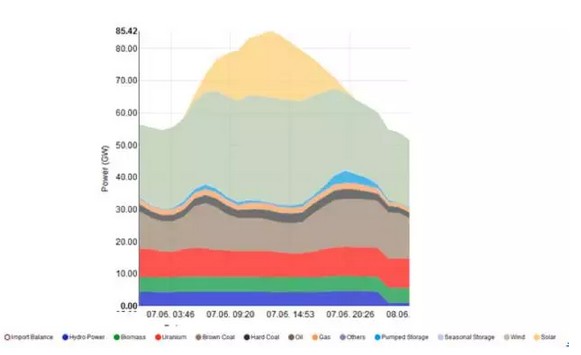 人們知道,就在2017年6月初,英國和德國的新能源發(fā)展先后到達(dá)了一個(gè)舉世矚目的重要節(jié)點(diǎn):就在6月7日這一天,英國超過50%的用電量是靠零排放的可再生能源來滿足的,而在德國,這一比例已經(jīng)達(dá)到75%左右,中午13點(diǎn)30分,德國可再生能源發(fā)電功率達(dá)到了63GW的新高,其中光伏發(fā)電20GW,陸上風(fēng)力發(fā)電28GW,海上風(fēng)力發(fā)電4.5GW,水力發(fā)電4GW,生物質(zhì)發(fā)電5.5GW,其總比已經(jīng)接近75%這一很久以前人們認(rèn)定新能源所無法企及的高線。
