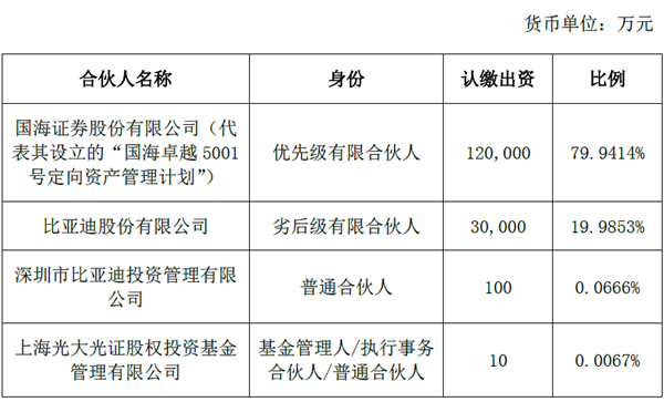 其中,汕頭市比亞迪云軌投資合伙企業(yè)(有限合伙)投資基金擬定的合伙人有比亞迪股份有限公司全資子公司深圳市比亞迪投資管理有限公司(作為“普通合伙人”)、上海光大光證股權(quán)投資基金管理有限公司(作為“普通合伙人”)、比亞迪股份有限公司(作為“劣后級(jí)有限合伙人”)、國海證券股份有限公司(作為“優(yōu)先級(jí)有限合伙人”,簡稱“國海證券”,代表其設(shè)立的“國海卓越5001號(hào)定向資產(chǎn)管理計(jì)劃”)。