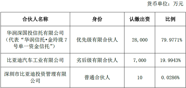 公告顯示,該投資基金規(guī)模為人民幣35,010萬元,其中深圳市比亞迪投資管理有限公司認(rèn)繳出資人民幣10萬元;比亞迪汽車工業(yè)有限公司認(rèn)繳出資人民幣7,000萬元;華潤深國投信托有限公司認(rèn)繳出資人民幣28,000萬元?;鸸芾砣藶樯钲谑斜葋喌贤顿Y管理有限公司。