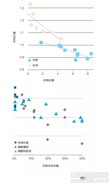 當(dāng)有風(fēng)有光的時(shí)候,電力系統(tǒng)嚴(yán)重供過于求,形成的價(jià)格(代表其市場(chǎng)價(jià)值)極低甚至為負(fù);而當(dāng)風(fēng)光不再的時(shí)候,系統(tǒng)嚴(yán)重的供小于求,價(jià)格很高。以年平均來看,風(fēng)電與太陽能在波動(dòng)性市場(chǎng)中的收益,將可預(yù)見的要小于傳統(tǒng)的可控機(jī)組。這種小的程度,會(huì)隨著可再生能源的增加而擴(kuò)大。