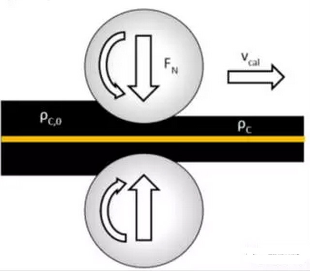 工業(yè)生產(chǎn)上,鋰電池極片一般采用對(duì)輥機(jī)連續(xù)輥壓壓實(shí),如圖1所示,在此過(guò)程中,兩面涂敷顆粒涂層的極片被送入兩輥的間隙中,在軋輥線載荷作用下涂層被壓實(shí),從輥縫出來(lái)后,極片會(huì)發(fā)生彈性回彈導(dǎo)致厚度增加。因此,輥縫大小和軋制載荷是兩個(gè)重要的參數(shù),一般地,輥縫要小于要求的極片最終厚度,或載荷作用能使涂層被壓實(shí)。另外,輥壓速度的大小直接決定載荷作用在極片上的保持時(shí)間,也會(huì)影響極片的回彈,最終影響極片的涂層密度和孔隙率。