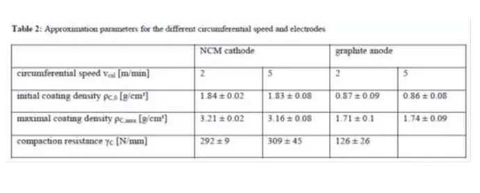 研究者對(duì)表1中所示NCM三元正極極片和石墨負(fù)極極片進(jìn)行輥壓實(shí)驗(yàn),研究輥壓工藝參數(shù)對(duì)極片涂層密度和孔隙率的影響規(guī)律。根據(jù)材料物理真密度計(jì)算,當(dāng)孔隙率為0%時(shí),正極涂層密度應(yīng)該為4.3 g/cc,負(fù)極涂層密度應(yīng)該為2.2 g/cc。而實(shí)際上根據(jù)實(shí)驗(yàn)數(shù)據(jù)擬合得到了參數(shù)(見(jiàn)表2)表明正極涂層達(dá)到的最大密度約3.2 g/cc,負(fù)極約為1.7 g/cc。