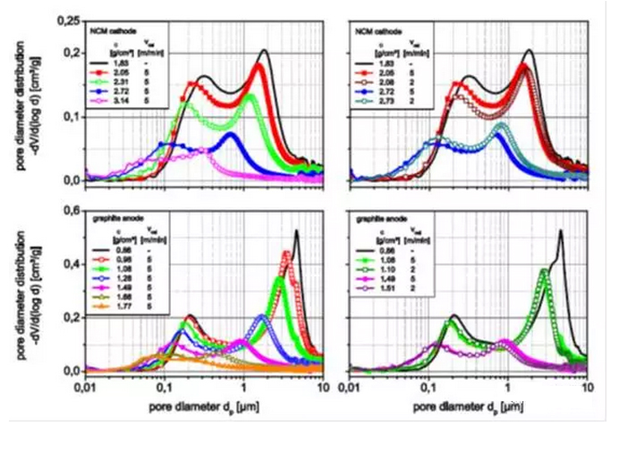 此外,從孔隙結(jié)構(gòu)角度分析輥壓工藝的影響。電池極片涂層的孔隙主要包含兩類:顆粒材料內(nèi)部的孔隙,尺寸為納米-亞微米級(jí);顆粒之間的孔隙,尺寸為微米級(jí)。圖5是不同輥壓條件下正負(fù)極極片中孔徑分布情況,首先很明顯可以看到極片壓實(shí)可以減小孔徑尺寸并降低孔隙含量。隨著壓實(shí)密度增加,與正極相比,負(fù)極孔徑尺寸更明顯降低,這是由于負(fù)極涂層壓實(shí)阻抗低更容易被輥壓壓實(shí)。同時(shí)數(shù)據(jù)表明輥壓速度對(duì)孔隙結(jié)構(gòu)的較小。