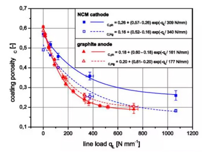 他們研究發(fā)現(xiàn),鋰離子電池極片的壓實(shí)過(guò)程也遵循粉末冶金領(lǐng)域的指數(shù)公式(4),這揭示了涂層密度或孔隙率與壓實(shí)載荷之間的關(guān)系。