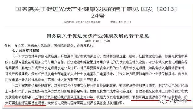 國務院2013年7月4日發(fā)布的國發(fā)〔2013〕24號《國務院關于促進光伏產(chǎn)業(yè)健康發(fā)展的若干意見》。其中第七大條完善支持政策中明確指出:上網(wǎng)電價及補貼的執(zhí)行期限原則上為20年。