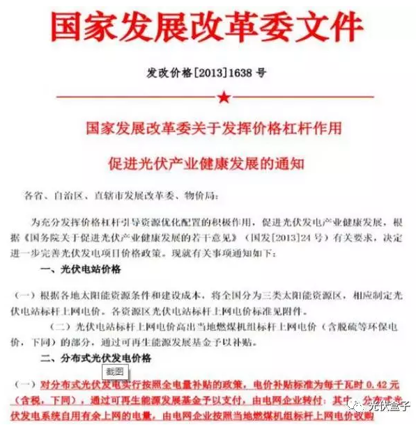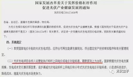 2013年8月26日國家發(fā)改委發(fā)布的發(fā)改價格〔2013〕1638號《國家發(fā)展改革委關于發(fā)揮價格杠桿作用促進光伏產(chǎn)業(yè)健康發(fā)展的通知》。文件第四條明確提出:光伏發(fā)電項目自投入運營起執(zhí)行標桿上網(wǎng)電價或電價補貼標準,期限原則上為20年。