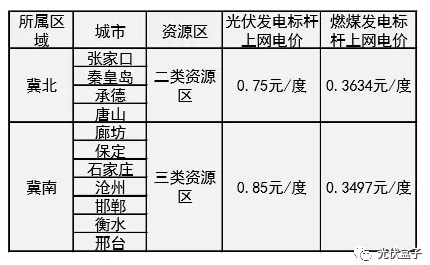 河北省分成了冀南和冀北兩片區(qū)域,其中,在冀北包括承德、張家口、唐山、秦皇島屬于二類資源區(qū)。保定、石家莊、廊坊、滄州、邯鄲、邢臺屬于冀南,屬于三類資源區(qū)。執(zhí)行的光伏發(fā)電標桿上網(wǎng)電價不同,燃煤發(fā)電上網(wǎng)電價也不同,具體2017年的價格如下: