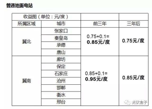 《河北省人民政府關于進一步促進光伏產(chǎn)業(yè)健康發(fā)展的指導意見》(冀政[2013]83號)規(guī)定,2014年底建成投產(chǎn)的光伏電站項目,其上網(wǎng)電價在國家確定的光伏電站標桿上網(wǎng)電價基礎上按照每千瓦補貼0.3元執(zhí)行,2015年底前建成投產(chǎn)的補貼0.2元,2017年底前投產(chǎn)的補貼0.1元,自投產(chǎn)之日起執(zhí)行3年。