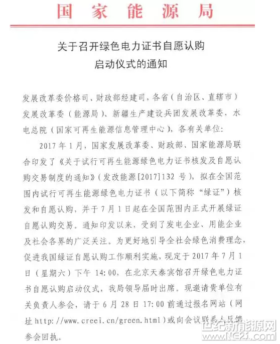 2017年7月1日,國家能源局即將召開綠色電力證書自愿認(rèn)購啟動(dòng)儀式: