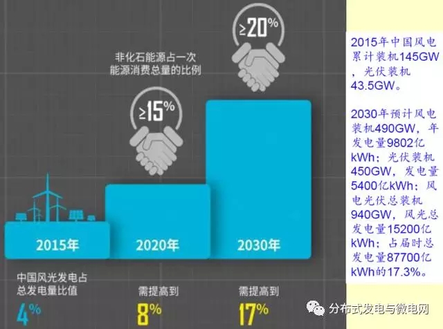 為達上述非化石能源20%目標,非化石能源貢獻要達到8.4億噸標煤,2030年水電裝機4億kW,核電1.5億kW,風電4億kW,光伏4億kW,從現(xiàn)在起,要求光伏每年裝機不少于25GW!2017年4月11日,由國際環(huán)保組織綠色和平攜手中國可再生能源學會風能專業(yè)委員會舉辦的《中國風電光伏發(fā)電的協(xié)同效益》報告發(fā)布。