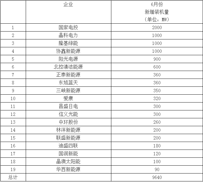 首先,各家企業(yè)6月份新增并網(wǎng)裝機(jī)容量的初步統(tǒng)計(jì)結(jié)果如下。需要強(qiáng)調(diào)的是,新增裝機(jī)量尚未經(jīng)過各家詳細(xì)統(tǒng)計(jì),因此根據(jù)匯總的信息采取四舍五入處理。
