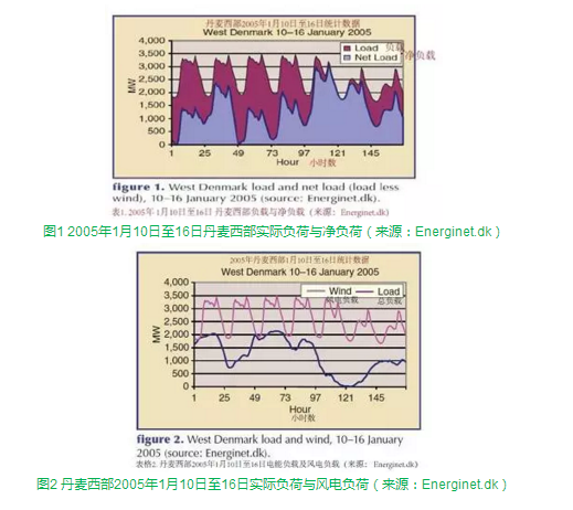 單個或多個風(fēng)電場的發(fā)電量是隨時間而變化的。風(fēng)電的變動性加之電力系統(tǒng)原本就存在的變動性,可能會增加變動的復(fù)雜性,需要電網(wǎng)運營商進(jìn)行管理和調(diào)控。風(fēng)能每發(fā)1度電,其他發(fā)電形式就可以少發(fā)1度電,所以其他的發(fā)電系統(tǒng)只需要滿足除風(fēng)電之外的負(fù)荷需求,這部分負(fù)荷經(jīng)常被稱作凈負(fù)荷(除風(fēng)電外負(fù)荷)。因此,整個電力系統(tǒng)的非風(fēng)力發(fā)電部分就要被調(diào)控至凈負(fù)荷,即整個電力系統(tǒng)負(fù)荷與風(fēng)電負(fù)荷之差。圖1顯示了丹麥西部地區(qū)一周內(nèi)的實際負(fù)荷與凈負(fù)荷,兩條曲線之間部分就是風(fēng)電部分。圖2更清晰地表示了實際負(fù)荷與風(fēng)電負(fù)荷之間的對比。